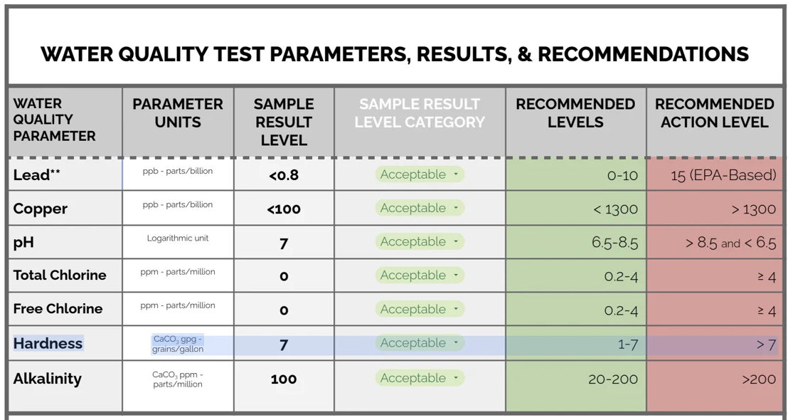 Water hardness is a measure of the concentration of minerals in the water, mainly magnesium and calcium. This can be measured and is one of the test parameters that is included in the ABP Water Quality Test. See the image below for sample results included in the ABP water quality test.
